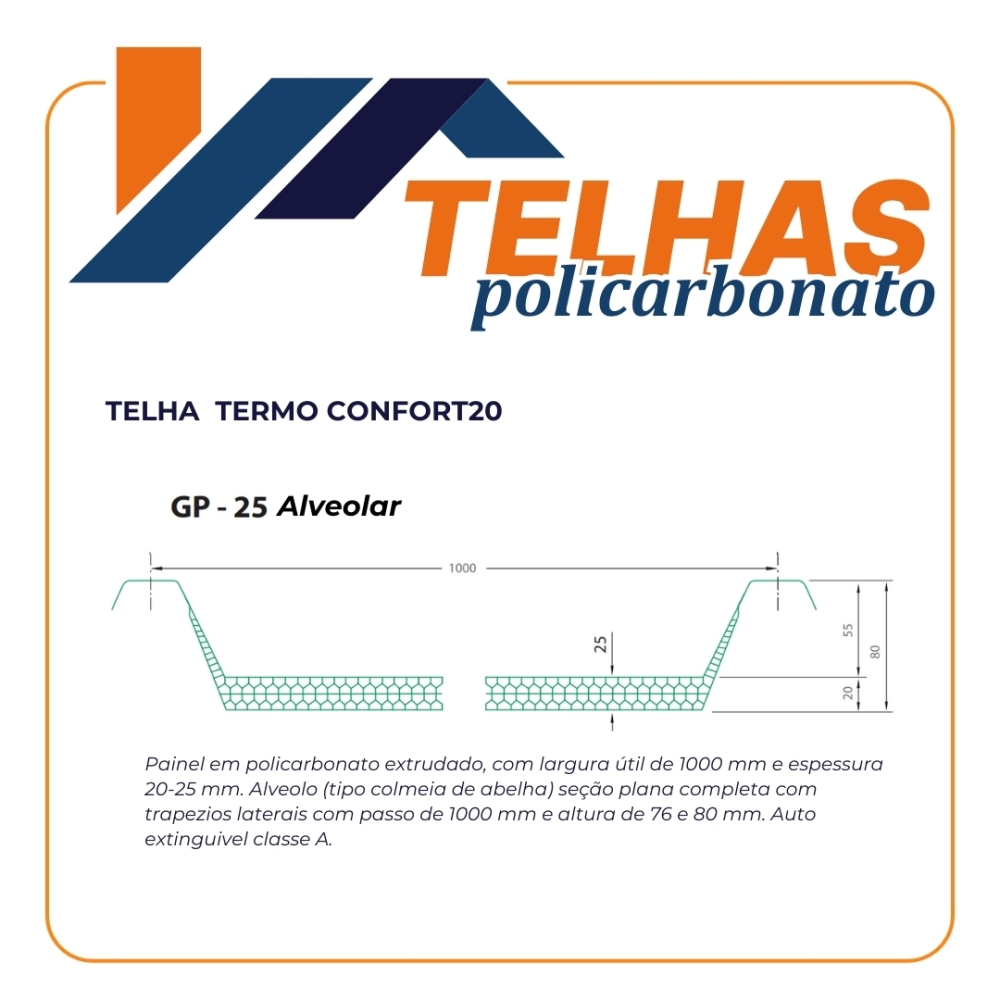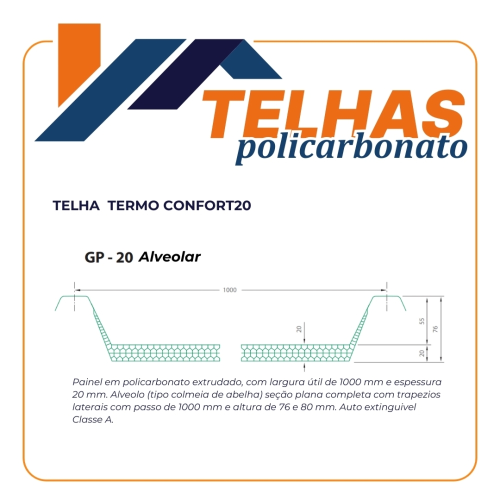 A Termo Confort20 é fabricada em policarbonato alveolar, do tipo colmeia de abelha. Isso faz com que ela seja super reforçada e se encaixe perfeitamente a qualquer tipo de telha metálica sanduíche. Proporciona excelentes características de conforto térmico, além de ser fabricada com até 14000mm de comprimento e em todas as cores.